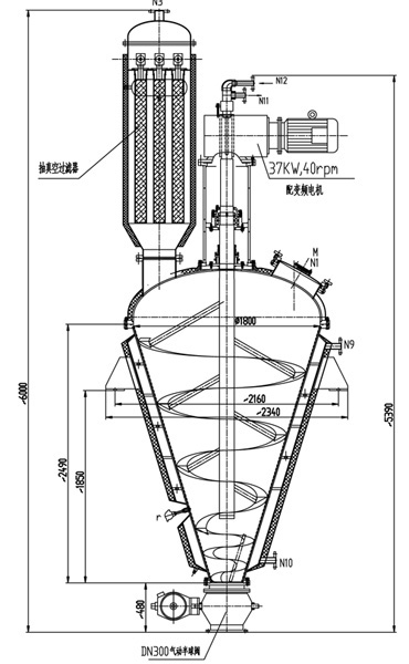锥形螺带混合器由碗,螺旋混合桨,旋转部件,缸盖,排放阀等组成。螺旋叶片通常由两层或三层制成,外螺旋从两侧向中心收集材料。螺旋层将物料从中心输送到两侧,形成对流混合,达到混合物料的效果。