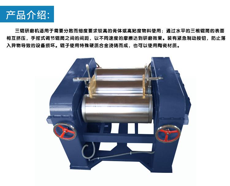 三辊研磨机主要用来研磨各种油漆,油墨、墨汁,油彩颜料、涂料、食品、巧克力、化妆品、医药、等膏状物料(不宜研磨足以导致辊筒腐蚀的原料)之用。近年来,在电缆料,人革塑料,肥皂和铅芯原料的制作领域也有较大的发展,因此,该机已成为这些厂家研细物料的主要设备。