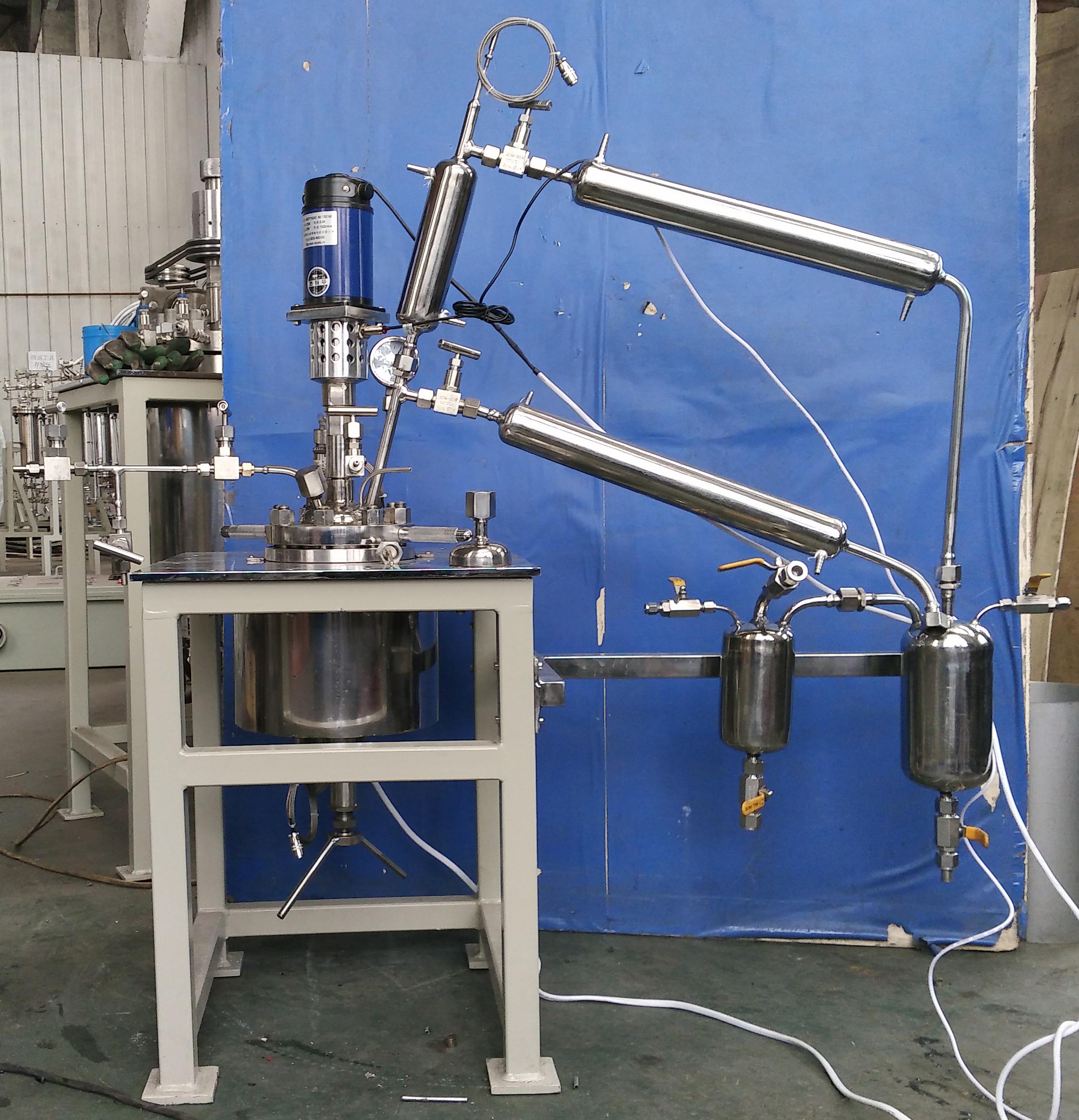 小型实验室用反应釜0.1 ~ 0.25L 无内部冷却盘管,0.1 ~ 0.5L 无固体进料口。常规釜的工作压力为10Mpa,搅拌速度0750r/min可调,工作温度300,主要接触材料为1Gr18Ni9Ti不锈钢,搅拌桨为螺旋桨状,电机为普通直流电机;常规釜盖打开:气相口装有针阀,液相口装有针阀,底管插入釜内,进料口装有电缆塞,测温控制口装有铂电阻,压力表安全防爆口装有压力表和防爆安全装置,釜内冷却盘管进出水口布水嘴;如果用户加装锅盖、釜口、内部结构、压力等级、搅拌桨等辅助装置(如冷凝回流装置、恒压加料罐、接收器、电容器等)有特殊要求可按用户要求加工制造。